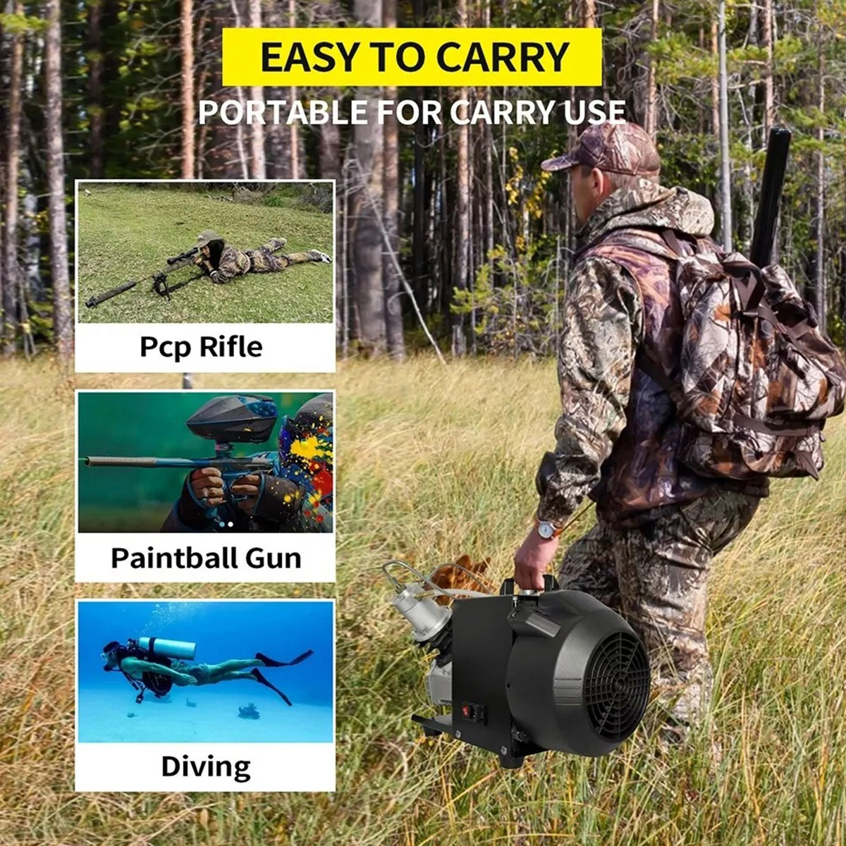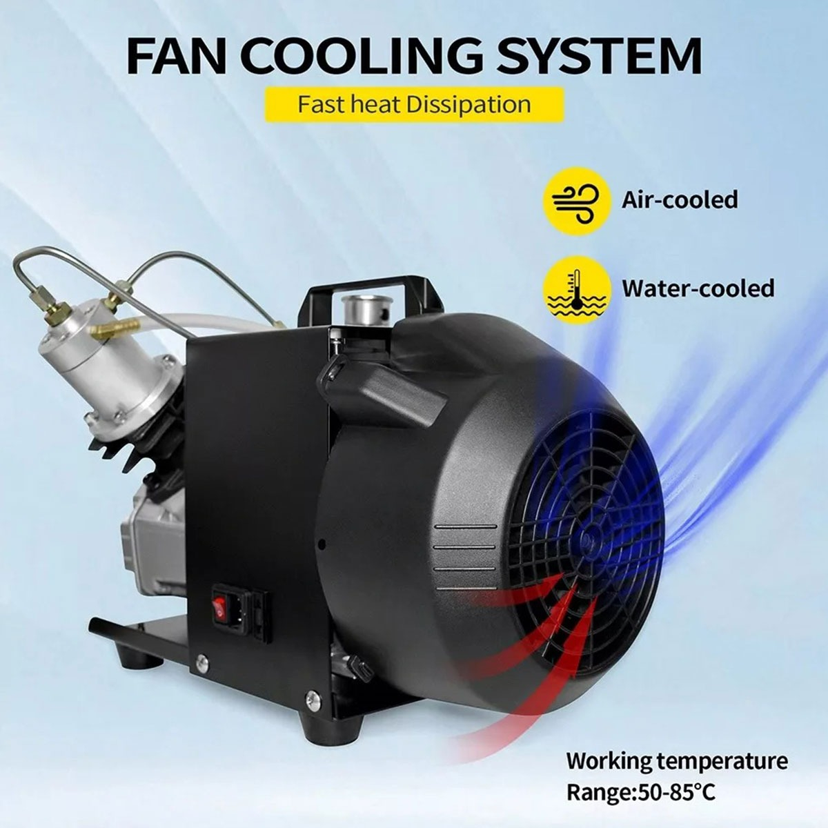 Este compresor PCP/buceo cuenta con filtración separadora de aceite y agua. La máquina descargará aire limpio, adecuado para mini botella de buceo, rifle PCP, tanque de paintball, pistola de aire comprimido, rifle de aire comprimido de paintball, extinción de incendios, detección de fugas, prueba de estanqueidad a la presión, prueba de impermeabilidad al aire, etc.