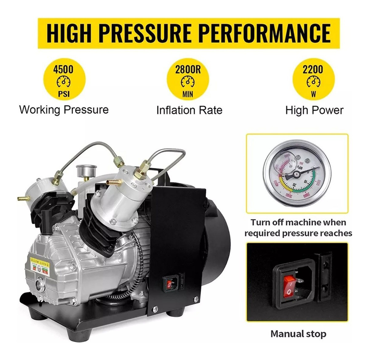Este compresor cuenta con un motor de cobre de alta potencia de 2200 W y un excelente rendimiento de inflado. La presión máxima de trabajo es de 4500 PSI, la tasa de inflado es de 2800 R/min y el caudal es de 40 L/min.