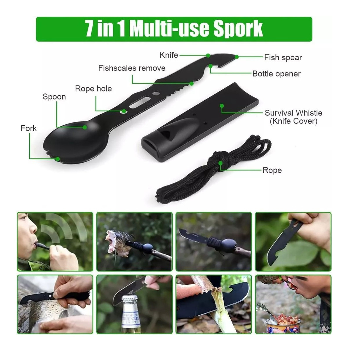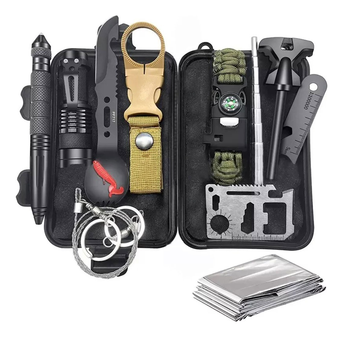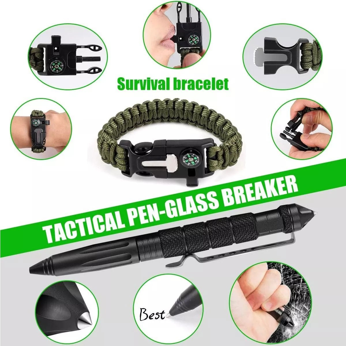 Equipo y equipo de supervivencia imprescindible: kit de supervivencia de emergencia incluye: herramientas de supervivencia para adaptarse mejor a tus necesidades. cuchillo de supervivencia mejorado}, pulsera de supervivencia, tenedor de cuchara multiuso, Manta de Emergencia termica, Cierra tipo cuerda de acero , Boligrafo reforzado con rompe cristal, soporte para botella a la mochila o cinturon, tuvo telescopico tipo caña o para alimentar con aire el fuego a una distancia adecuada , señuelo de vinilo , pedernal con regla y destapador , Linterna tactica a pila AA (no incluye pila), Tarjeta multi uso tactica de supevivencia metalica