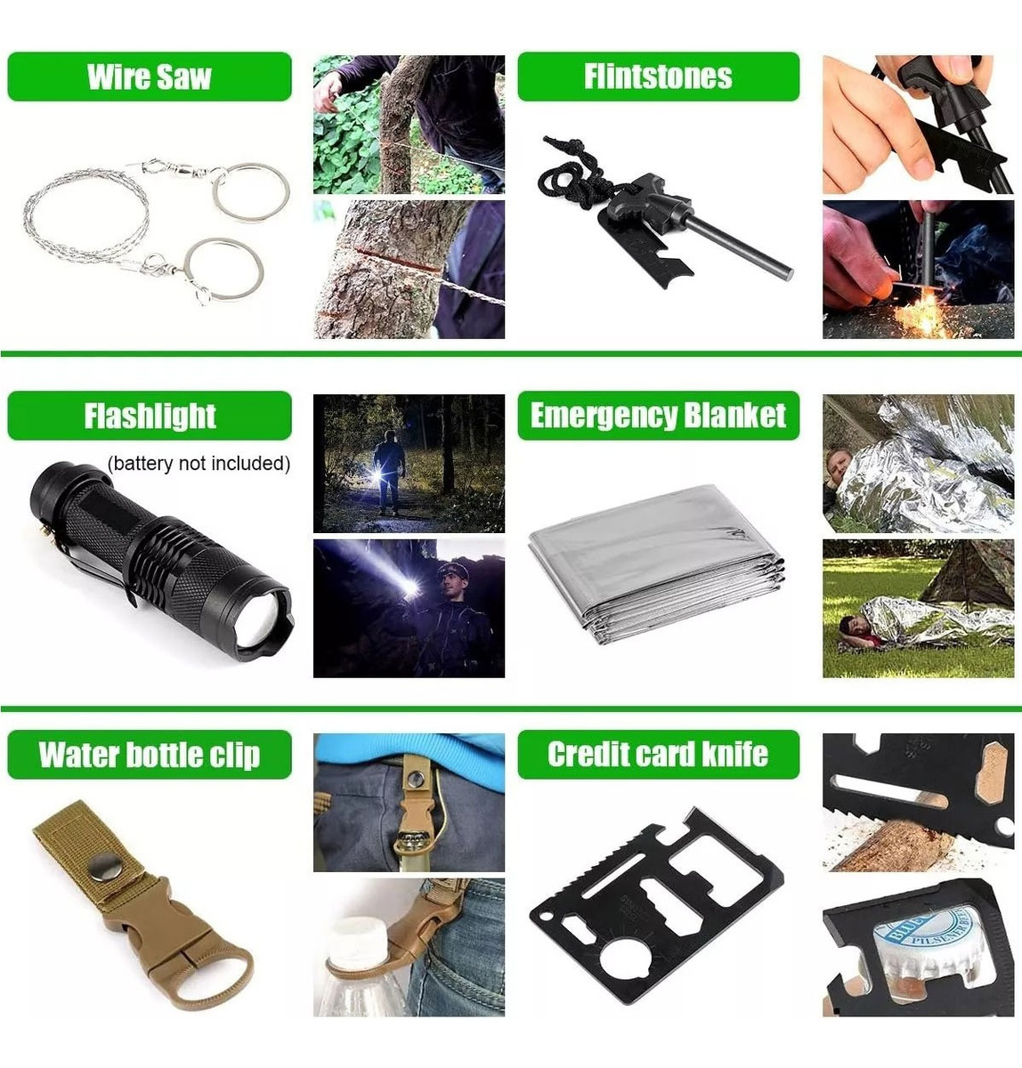 Preparado para cualquier emergencia: el kit de emergencia de supervivencia incluye suministros de emergencia que son adecuados para la supervivencia al aire libre o campamento.