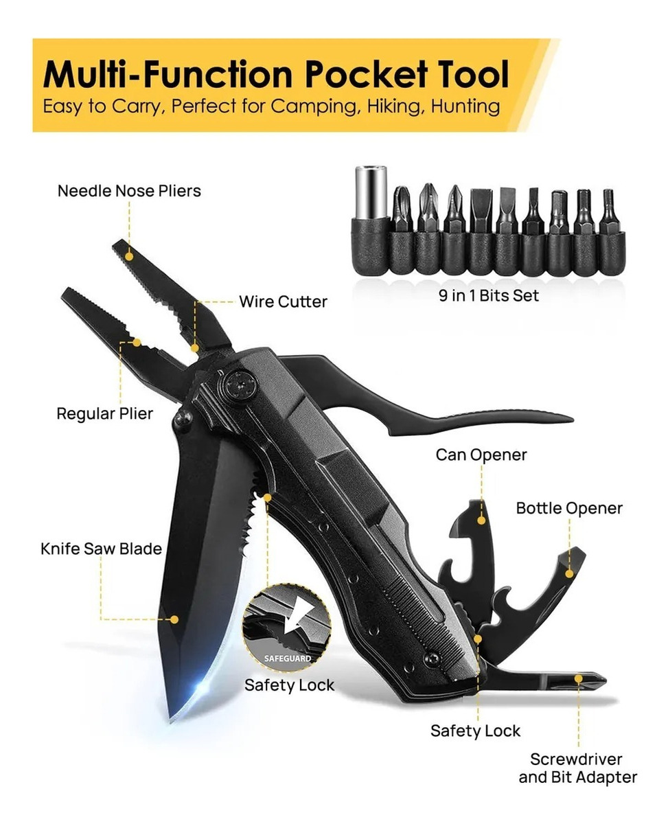 Navaja suiza Multper con cuchillo/hoja de sierra, alicates, abrelatas, abridor de botellas y un juego de destornilladores de 9 posiciones. ¡El inteligente diseño plegable le permite ahorrar aún más espacio! Ya sea bricolaje, deportes al aire libre, camping o senderismo, la navaja multiherramienta es su ayudante perfecta.